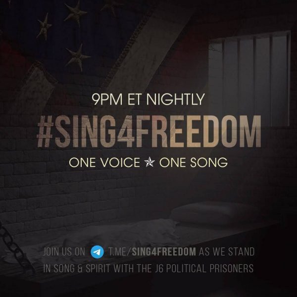 Thus was born the #SING4FREEDOM campaign that now has thousands of Americans singing their National Anthem each night at 9PM eastern time, in solidarity with the political prisoners of the DC Gulag. Using social media platforms and appearances at patriot events and functions, JOSEPH THOMAS, whose telegram nickname is Pi Anon, began to encourage everyday American patriots to step out of their doors and onto their porches, into their yards at 9PM Eastern each night and SING for FREEDOM by belting out our National Anthem with these political prisoners. The response was startling and amazingly viral as more and more conservative Americans began to learn the truth of that day and how these patriots were being treated; the singers seemed to multiple across the country as more and more parents, children, neighbors, all began to SING with their fellow patriots in a celebration of Liberty, a patriotic show of support, and a reminder that we are still ONE as a Constitutional Republic of Free Men and Women! This patriotic campaign spread even into the political headlines, as the crowd at a SAVE AMERICA Rally interrupted President Trump’s speech and spontaneously broke into their Anthem at 9PM, led by another J6 defendant within the crowd. This amazing show of solidarity has served as a touchstone for these incarcerated Patriots, giving them a sense of connection with the growing Patriot Family of J6 supporters, many of them now singing alongside their fellow patriots at 9PM each night.